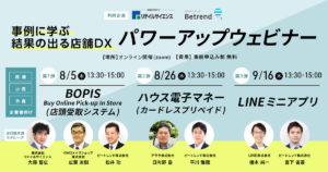 『LINEミニアプリ』や最近注目を集める『BOPIS:Buy Online Pick-up In Store(店頭受取システム)』、『ハウス電子マネー』など、DX推進による営業利益の担保・生産性向上につながるソリューションを、各開催日ごとに異なる内容でご案内致します。