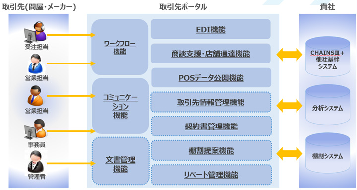 商談プロセスを網羅してシステム化することで、商談の効率化や情報の一元化を実現します。システムはクラウドで提供され、小売業様・取引先様ともにブラウザを通じて利用できる仕組みです。