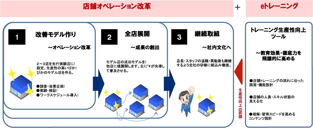 トレーナーは訪店せずに、Eラーニングを通してスタッフ指導できるので生産性が大幅に向上